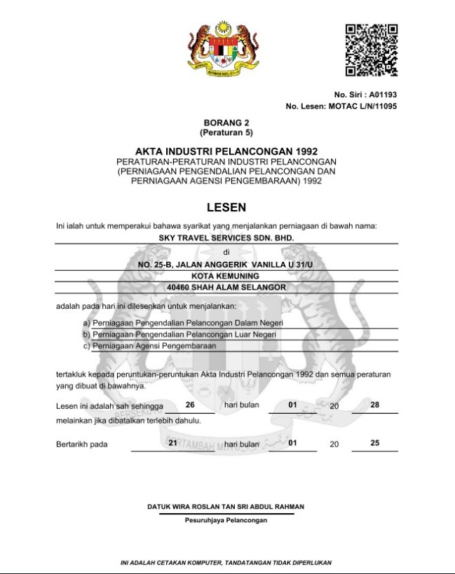 Syarikat ini didaftarkan secara sah di bawah Suruhanjaya Syarikat Malaysia (SSM) sebagai Sky Travel Services Sdn. Bhd. sejak 4 November 2022.